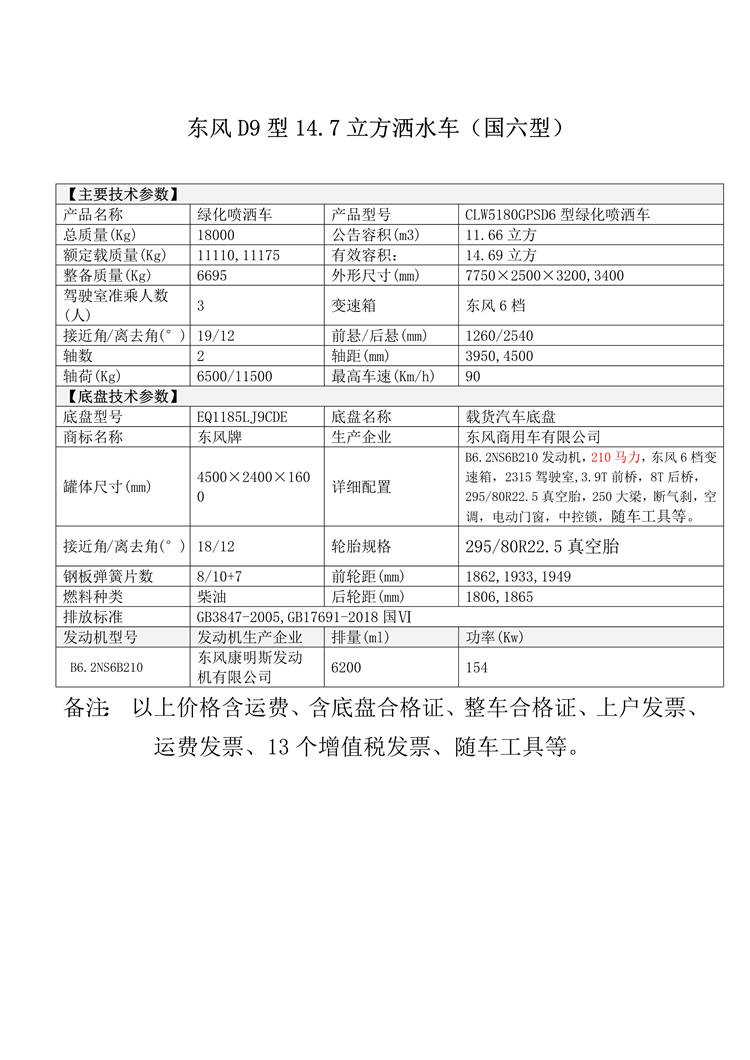國六東風D9型14.7立方灑水車